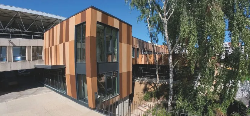 - L’entrée située désormais face à celle de l’OMAC (Office municipal d’animation de la cité) et tournée vers un vaste espace piétonnier