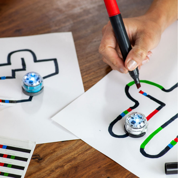 À l'aide de feutres de couleurs, programmez et commandez des petits robots Ozobot. Dessinez leur voyage sur une feuille de papier.